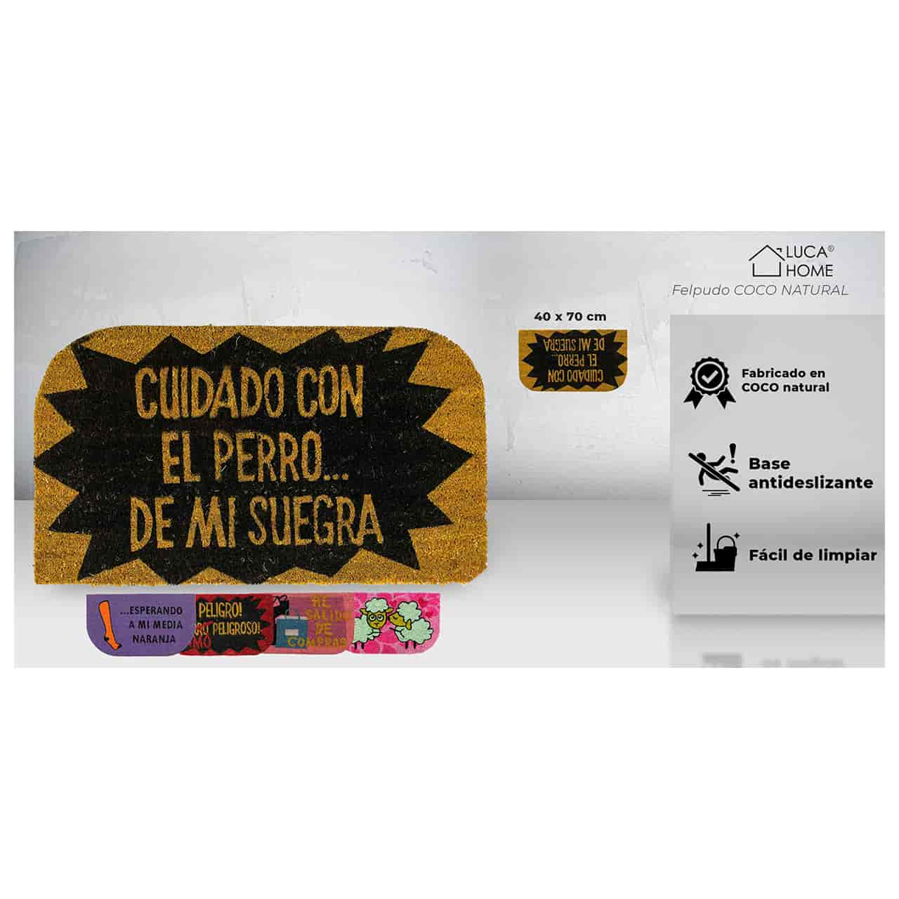 - Muchas opciones diferentes de diseño. Elige el diseño del felpudo de coco que más se adapte a la superficie o zona donde quieras colocarlo. Desde LucaHome te proporcionamos opciones diferentes de diseño con muchas frases y dibujos diferentes. El tamaño del felpudo es de 40×70 cm.