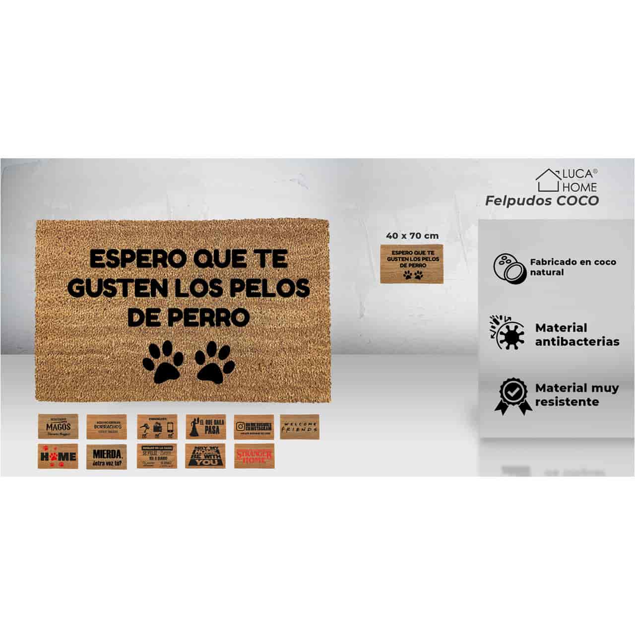- Muchas opciones diferentes de diseño. Elige el diseño del felpudo de coco que más se adapte a la superficie o zona donde quieras colocarlo. Desde LucaHome te proporcionamos opciones diferentes de diseño con muchas frases y dibujos diferentes. El tamaño del felpudo es de 40×70 cm.