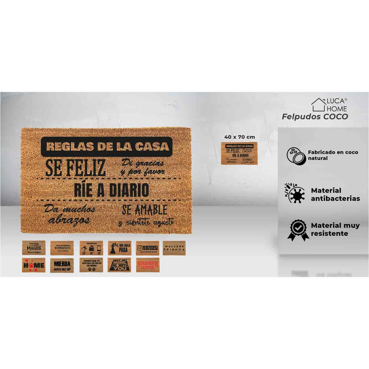 - Muchas opciones diferentes de diseño. Elige el diseño del felpudo de coco que más se adapte a la superficie o zona donde quieras colocarlo. Desde LucaHome te proporcionamos opciones diferentes de diseño con muchas frases y dibujos diferentes. El tamaño del felpudo es de 40×70 cm.