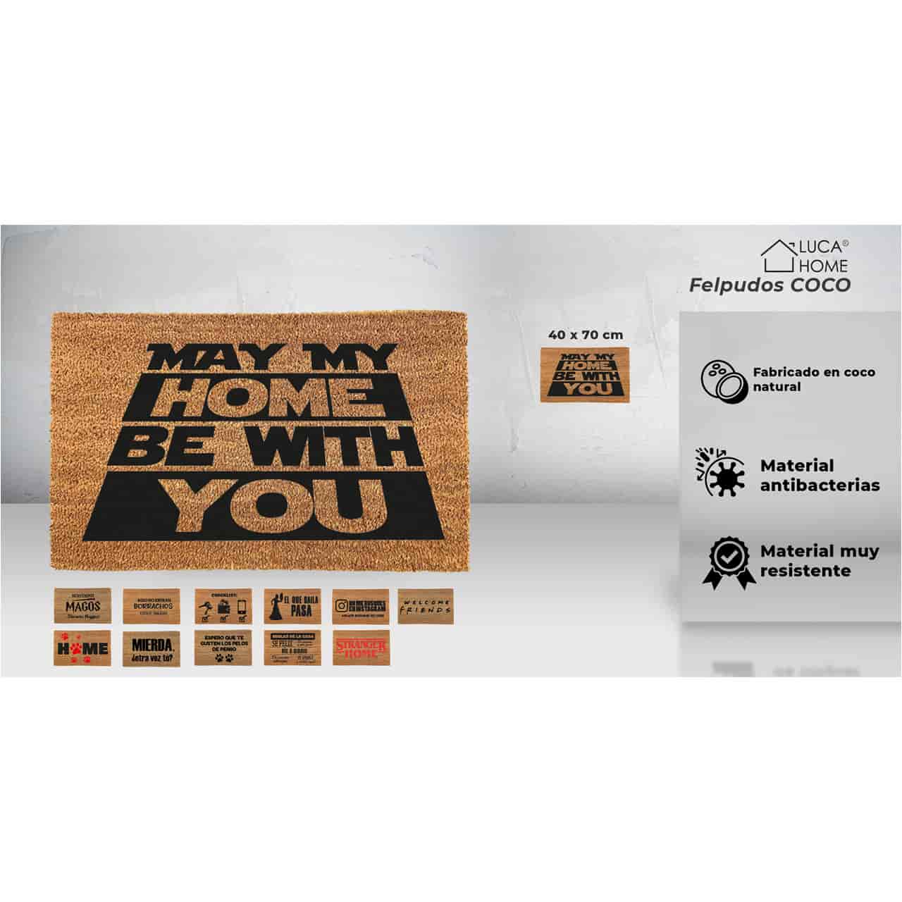 - Muchas opciones diferentes de diseño. Elige el diseño del felpudo de coco que más se adapte a la superficie o zona donde quieras colocarlo. Desde LucaHome te proporcionamos opciones diferentes de diseño con muchas frases y dibujos diferentes. El tamaño del felpudo es de 40×70 cm.