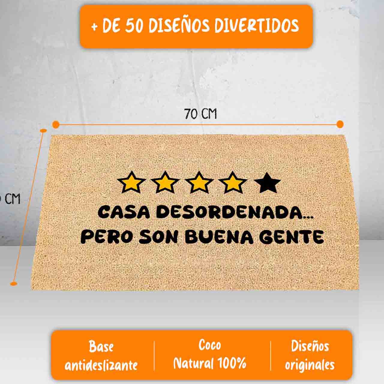 El felpudo de fibra de coco «Casa Desordenada» lleva un mensaje lleno de humor y cariño, ideal para aquellos hogares que se enorgullecen de su ambiente vivido y alegre. Este felpudo no solo sirve como una bienvenida cálida a la casa, sino que también es una declaración divertida que dice: «Aquí, un poco de desorden es signo de felicidad».
