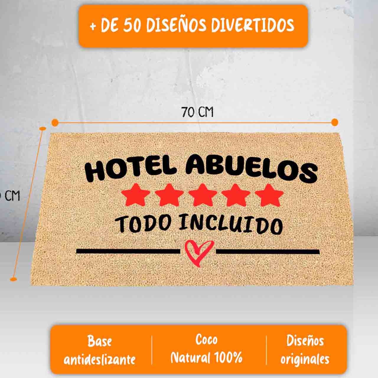Este felpudo no es solo un objeto funcional, sino también un regalo lleno de amor y humor. Su diseño, que representa un acogedor «Hotel Abuelos», invita a la sonrisa y añade un toque personal y cálido a cualquier entrada. Fabricado con coco natural, el felpudo es resistente y duradero. Su diseño impreso de alta calidad asegura que los colores vivos y el mensaje divertido se mantengan a lo largo del tiempo. Además, la base antideslizante proporciona seguridad y estabilidad.