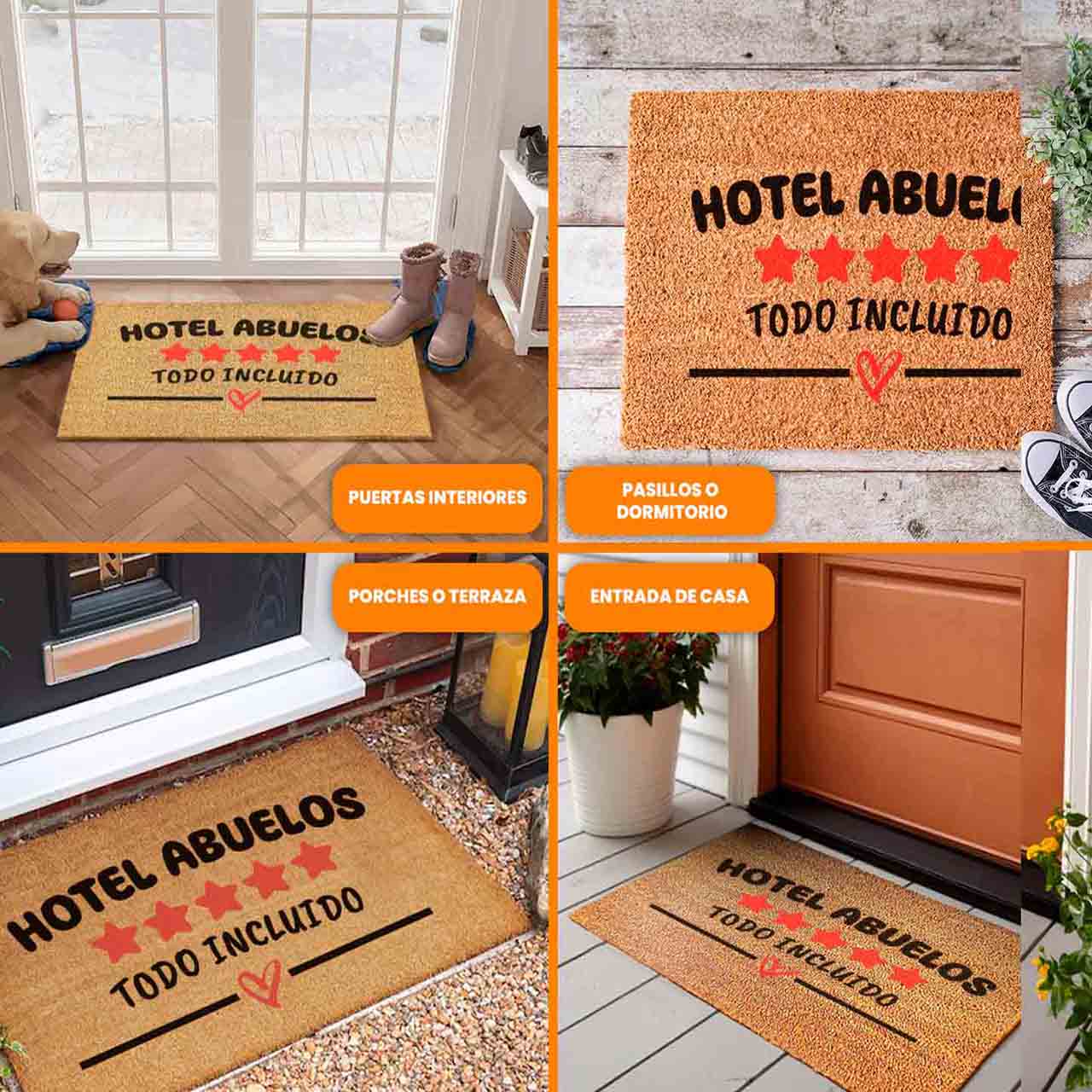 El felpudo de coco «Hotel Abuelos» representa una mezcla encantadora de funcionalidad y cariño, ideal para adornar la entrada de la casa de los abuelos.