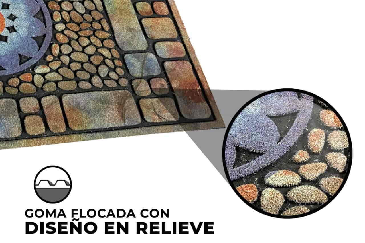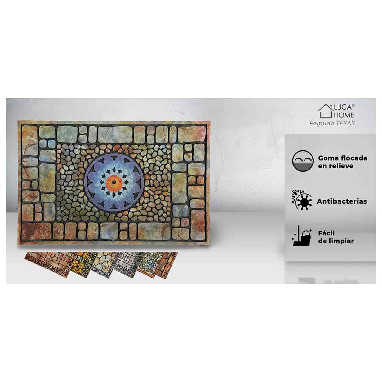 - 7 opciones de forma, patronaje o diseño en relieve. Elige el patrón o diseño del felpudo de goma flocada que más se adapte a la superficie o zona donde quieras colocarlo. Desde LucaHome te proporcionamos opciones diferentes de diseño en relieve de acuerdo a los siguientes patrones: Bienvenidos y piedras, welcome y piedras, mosaico, piedras, welcome y ladrillos, welcome y hojas, rombos. El tamaño del felpudo es de 45×75 cm.